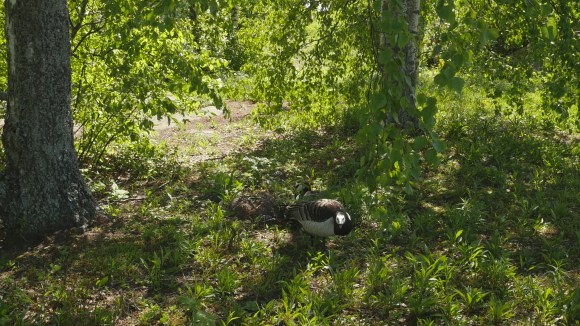 Sitting on the lowest branch of the birch on the hill on Harakka Island is not as easy as I expected. In May I spent two weeks gallery sitting for my exhibition The Tree Calendar in the Telegraph Gallery and waited until the very last day to go and record an image of the branch – without me sitting on it though. Why? Because the site was occupied by a goose couple who was nesting next to it. With a common eider that would have been no problem, they sit calmly even when you come fairly near them. But the goose guys are really aggressive, protecting the hen sitting on the eggs, or at least pretending to do so, by attacking everybody who tries to come near. I waited and hoped that the chicks would hatch out and start moving, but no. Today, on the last day of the exhibition, and the next to last day of the month, I decided I would have to accept the situation and record an image of the branch and the geese: