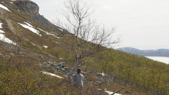 And thirdly, I have performed or posed with various birches up on the tree line, on the slopes of Saana fell and in the area between Saana and Jeahkas fell. There I wrote a letter to a birch growing next to a brook, documented on the same page, here.