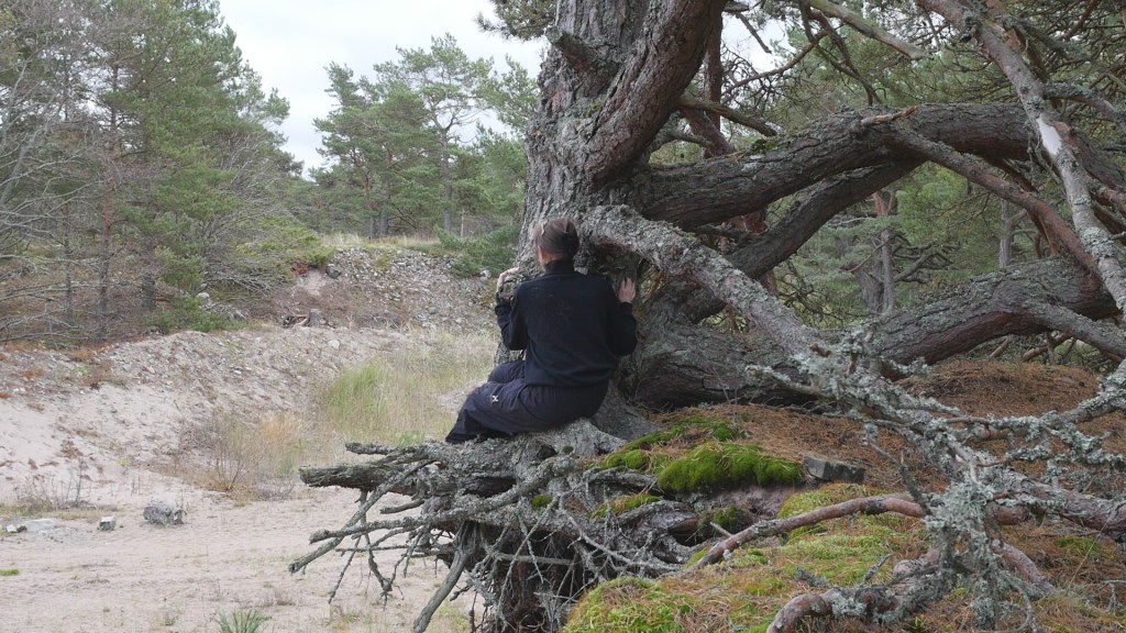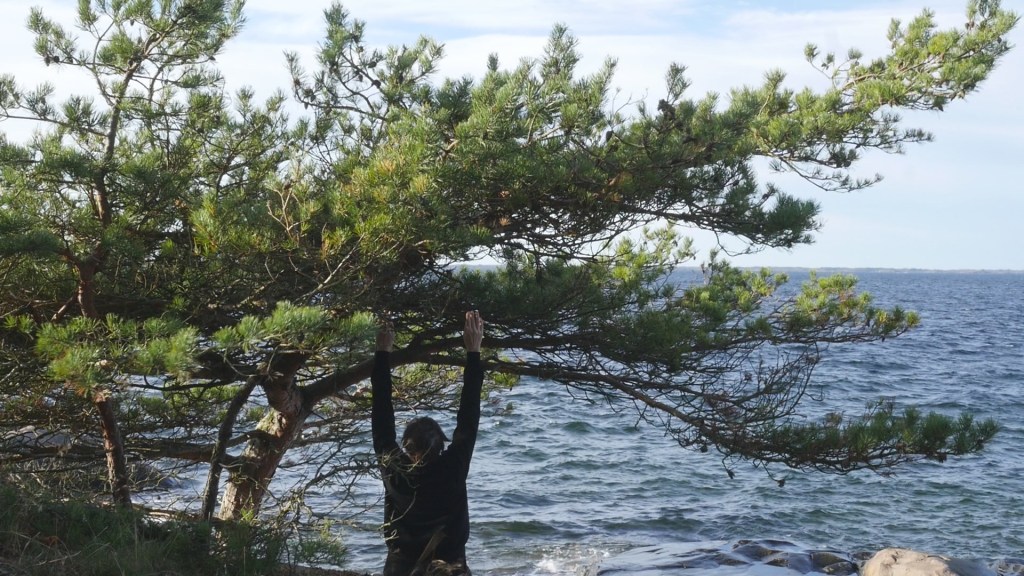 Bending with the Pine II, performed 6.11.2020 with a pine on Örö, see https://www.researchcatalogue.net/view/761326/1036306/72/582